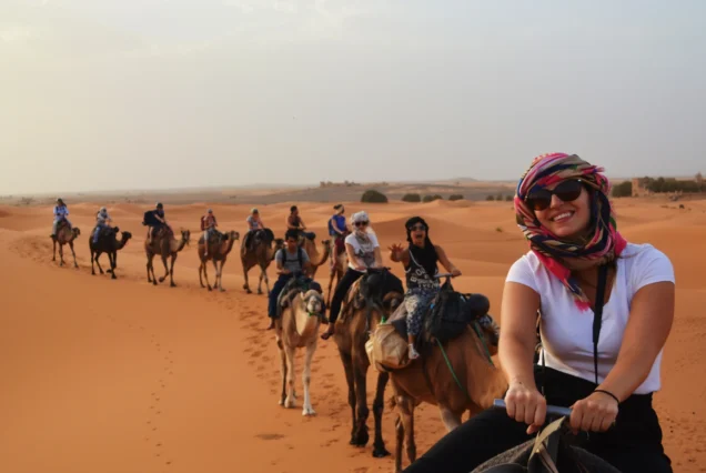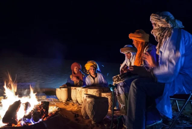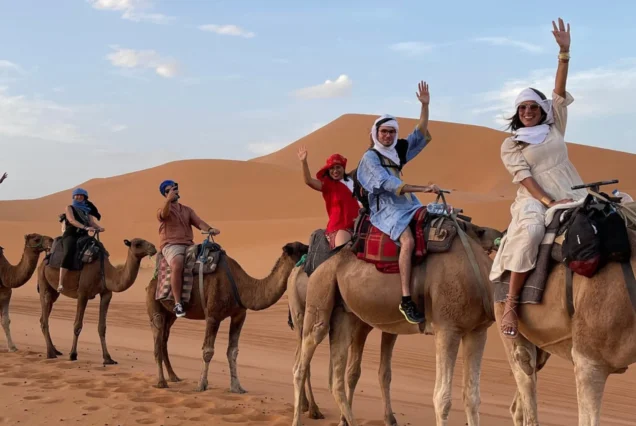 Prima colazione in casa (o in albergo). Escursione in 4×4: visita di tutto il deserto dell’Erg Chebbi, dei laghi tra le dune di Khamilia, del villaggio dei musicisti Gnaoua (o Gnawa), degli ex schiavi di Sudanthe, della zona dei fossili e delle vecchie miniere Partenza per l’escursione “Notte berbera”: giro in dromedario. Arrivo al campo, cena sotto le stelle e notte in una tradizionale tenda berbera.