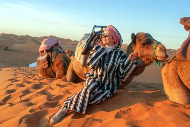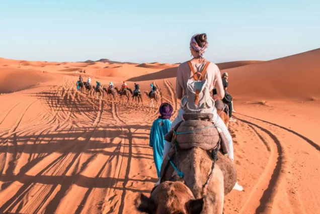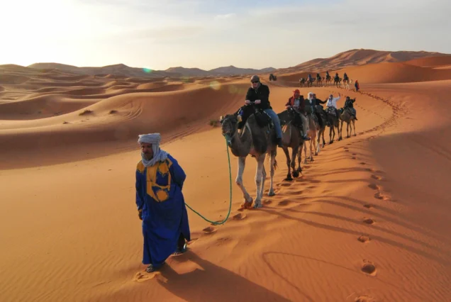 Dopo la prima colazione, attraverseremo le dune di Merzouga, passeremo per i villaggi nomadi e ci fermeremo al villaggio di Khamlia, dove vive il popolo nero, famoso per la sua musica. Visiteremo poi le miniere di Mifiss, l’oasi di Tissardmine e ci fermeremo per un tè alla menta con i berberi del deserto. Torneremo in albergo per il pranzo e un breve riposo. Nel pomeriggio monteremo i nostri Cammelli, per una piacevole e rilassante passeggiata nelle dune, dove assisteremo poi allo spettacolo del tramonto, dal punto più alto. Proseguiremo poi verso il nostro accampamento, dove ci verra servita un’ottima cena tipica, tra balli, canti Berberi ed un cielo stellato.