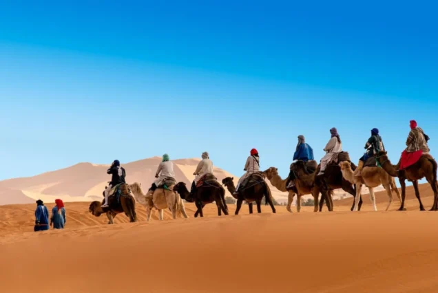 Lascieremo i bagagli in albergo e tutto quello che non è necessario nel deserto e faremo un escursione con i cammelli per circa un’ora e mezza che ci porta ai piedi della Grande Duna, e vedremo un bel tramonto nel deserto. Cena e pernottamento al campo nel deserto in una tenda sotto un baldacchino di stelle spettacolare.