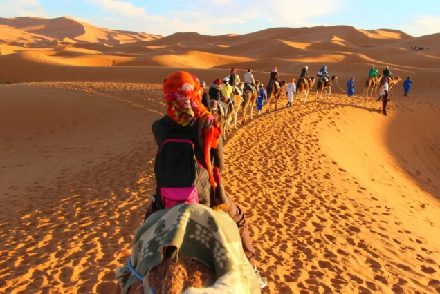 È bene alzarsi prima dell’alba per ammirare il sorgere del sole sulle imponenti dune. Ritorno all’hotel in cammello per una doccia rinfrescante e la colazione. Escursione nell’Erg Chebbi con il 4×4, la distesa sabbiosa del deserto, dove si trova la duna più alta del Marocco, seguendo una pista dell’ex Parigi-Dakar, con le montagne che segnano il confine con l’Algeria.